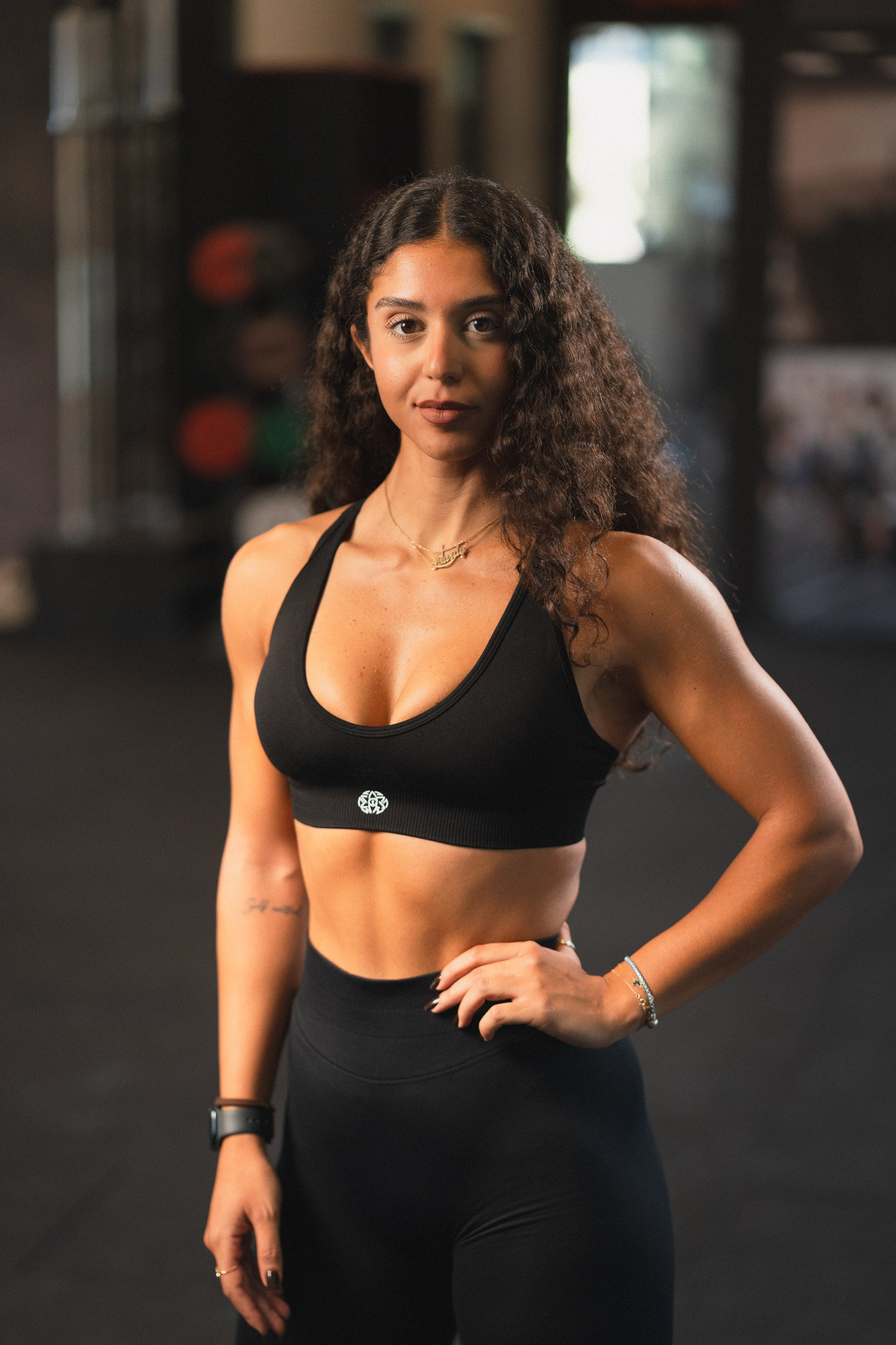 Crossed back lines that define movement, breathable, and lightly padded (removable) for confidence that stays with you through every rep.